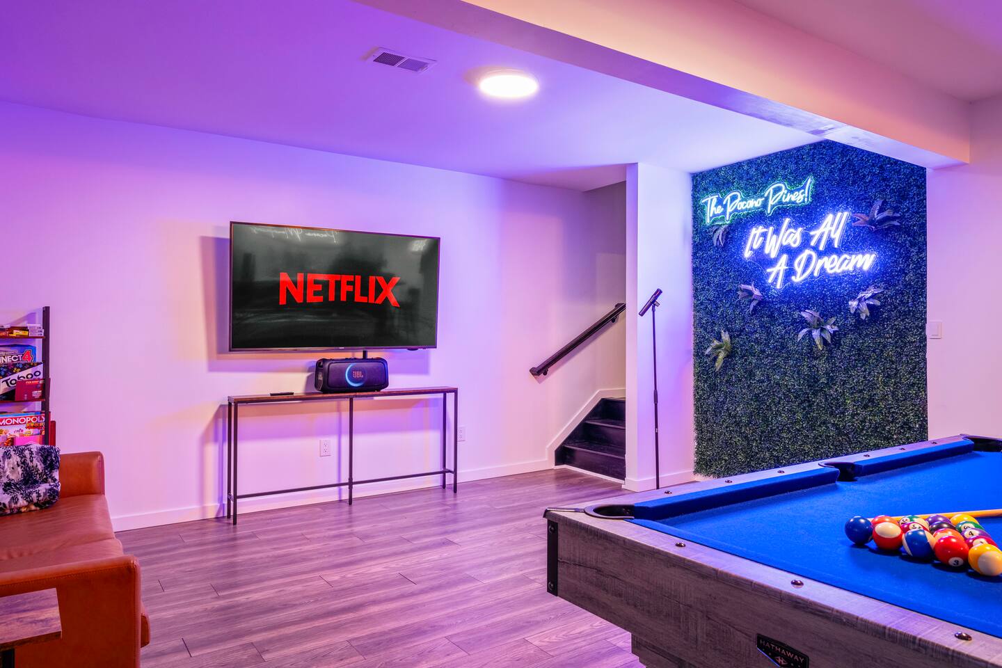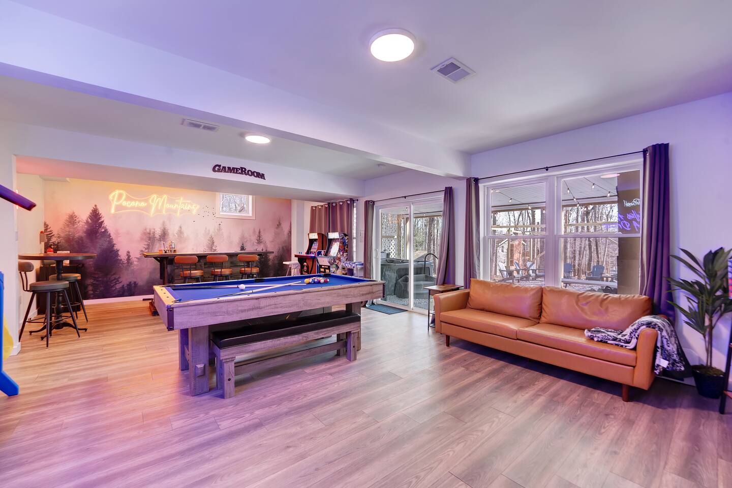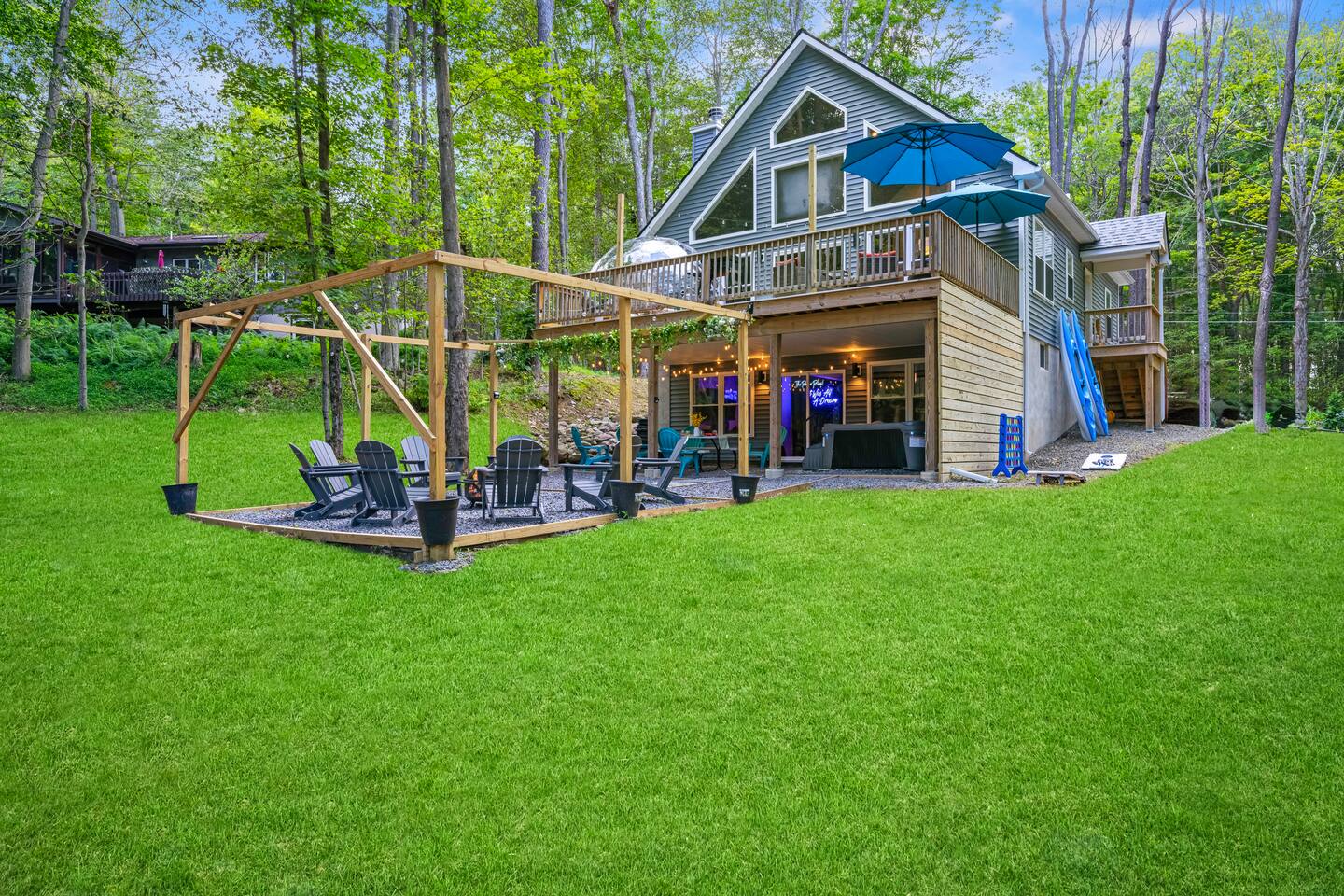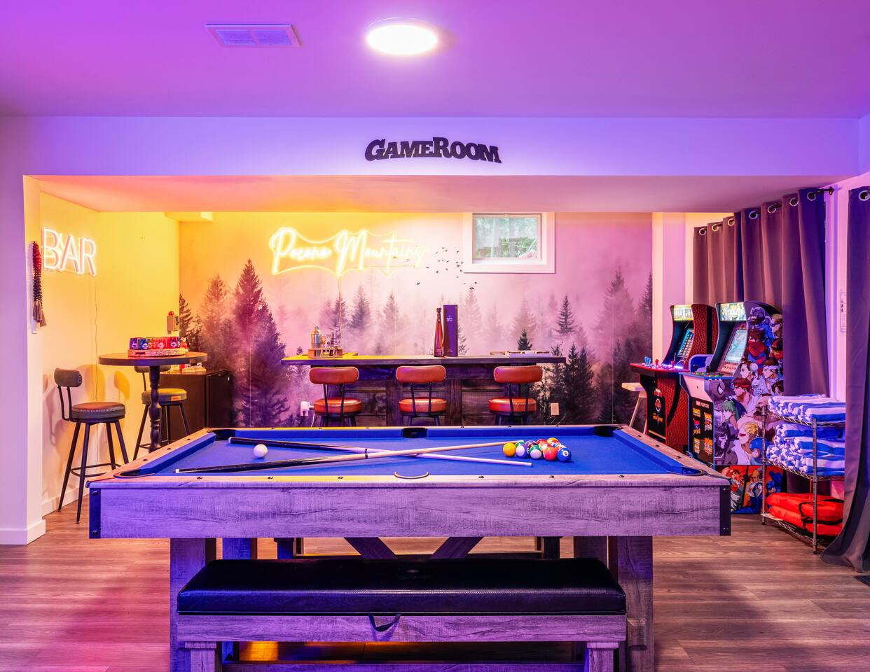 Welcome to your home away from home in the heart of the Poconos — where comfort, connection, and adventure come together in one unforgettable stay. Why You’ll Love It • Brand-New Hot Tub, Firepit & Transparent Dome Lounge – Sink into relaxation under a blanket of stars in your glowing dome lounge, complete with twinkle lights and plush seating — perfect for stargazing, sipping wine, or sharing stories that stretch long into the night. • Ultimate Game Room & Home Theater – Arcade games, pool table, karaoke, and a cinema-style theater for laughter-filled nights with family and friends. • Sleek Bar & Lounge – A stylish space to unwind with cocktails and great company. • Spacious Living & Dining Area – Gather around the brand-new dining set in the grand living room — the perfect setting for shared meals and lasting memories. • Expansive Private Deck – Outdoor dining, propane firepit, BBQ grill, and the glowing dome just steps away for magical evenings under the sky. • Family & Friends Ready – Designed with families in mind, this chalet comfortably hosts up to 12 guests, offering space for connection, play, and peaceful moments for everyone. • Exclusive Big Bass Lake Access – Private beaches, pools, sports courts, trails, and more — all just steps away. Main Floor – Comfort Meets Elegance • Grand living room with wood-burning fireplace, Smart TV, plush seating, and a brand-new dining set for family-style meals • Fully stocked gourmet kitchen and dining area (includes high chair) • Primary suite with king bed, Smart TV, soaking tub, and separate shower • Second king bedroom with Smart TV • Full bathroom & laundry room • Expansive deck featuring outdoor dining, grill, firepit, and access to the brand-new hot tub and recently added dome lounge Top Floor – Family-Friendly Comfort • Two bunk bedrooms (twin-over-queen) with books and puzzles • Dedicated work area with scenic forest views • Full bathroom Lower Level – The Entertainment Hub • Game room with arcade machines, poker set, pool & ping-pong tables • Karaoke station and home theater with oversized sectional and surround sound • Evening lounge and bar • Fifth bedroom & full bathroom • Walk-out to hot tub and firepit patio Big Bass Lake Amenities Enjoy a resort-style experience within this private, gated community: • Private lakes & beaches (two kayaks provided free) • Heated outdoor and seasonal indoor pool • Tennis, basketball, and volleyball courts • Hiking trails, playgrounds, and more Amenity Pass Pricing: • Weekday – $8 per person/day (kids under 7 free) • Weekend/holiday – $10 per person/day • Weekly (non-holiday) – $30 per person • Holiday week – $50 per person (Passes available at the Clubhouse or Admin Building) Note: Community amenity hours and seasonal openings are set by the Big Bass Lake HOA and may change without notice. Important Booking Info • HOA requires full names of all guests at least 3 days before check-in (no pre-check-in = no entry) • $50 fee for any guest list changes after submission • If your reservation is made within 3 days of arrival: – A $100 HOA processing fee is charged by the community – A $100 last-minute coordination fee is applied by the host to prepare the home on short notice • If your reservation is made more than 3 days before arrival: – A reduced $50 standard coordination fee applies – The $50 HOA fee is covered by the host, so guests do not pay it House Rules • Primary guest must be 25+ and present for the entire stay • No third-party bookings • Maximum occupancy: 12 guests • Security camera at driveway only (no indoor cameras) • No Indoor Smoking: Smoking inside the home, the dome, or any indoor area is strictly prohibited. A $500 odor-remediation fee applies if cigarette or cigar odor is detected after checkout Nearby Attractions • Kalahari Indoor Water Park – 15 min • Camelback Mountain Resort – 30 min (skiing, tubing, waterpark) • Bushkill Falls – 25 min (“Niagara of PA”) • Promised Land State Park – 20 min • Big Pocono State Park – 30 min • Gouldsboro State Park – 20 min • Hickory Run State Park – 35 min • The Crossings Premium Outlets, Pocono Raceway, wineries & breweries – 30–35 min Additional Notes • Private well water may have slightly lower pressure than city systems • Property includes stairs and is not wheelchair accessible Recent Upgrades & Stay Highlights Enjoy 2025 enhancements including a brand-new hot tub, new dining set, and a recently added transparent dome lounge — each designed to make your stay more luxurious, memorable, and one-of-a-kind. Your Perfect Poconos Getaway Starts Here Every corner of Pocono Pines Chalet was designed with love and care. Whether you’re gathering by the fire, exploring the trails, or stargazing from the dome, we can’t wait for you to experience the joy this home brings.