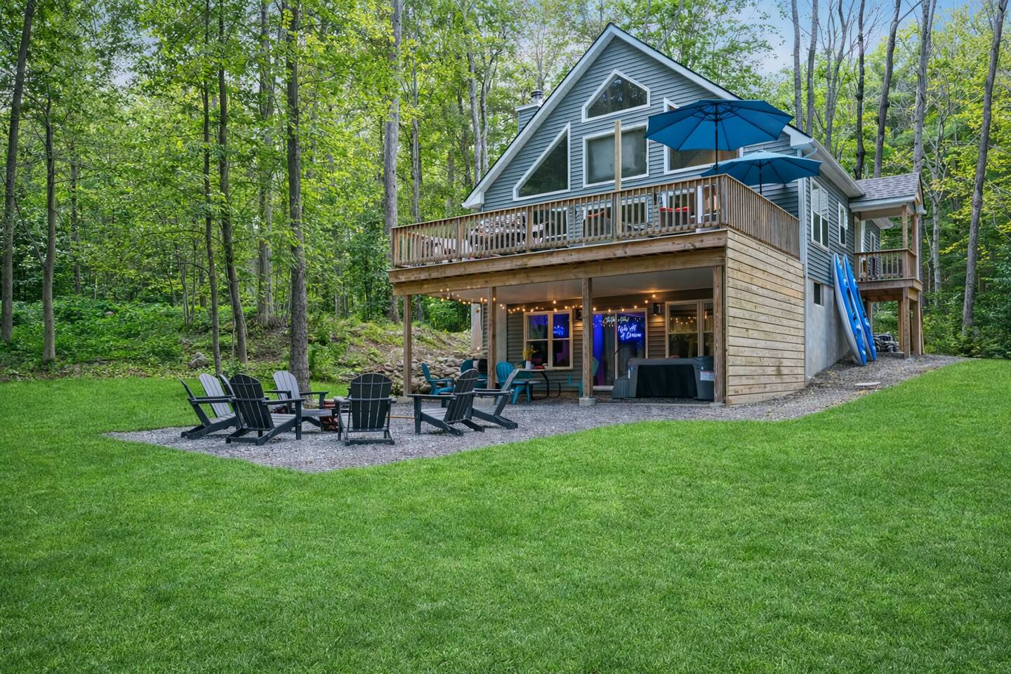 Welcome to your private Pocono retreat — a spacious chalet designed for elevated group getaways in every season. With a private outdoor dome, hot tub, fire pit, theater, game room, karaoke, and bar lounge, this home was built for memorable stays with family and friends. Why You’ll Love It • Private Dome, Hot Tub & Fire Pit – Unwind in the private outdoor dome under twinkle lights, soak in the hot tub, or gather around the fire pit for memorable evenings surrounded by nature • Theater, Game Room & Karaoke – Enjoy movie nights in your private theater, plus arcade games, pool, ping-pong, poker, and karaoke for all-day entertainment • Bar Lounge & Gathering Spaces – A stylish lower-level lounge and bar create the perfect setting for drinks, conversation, and quality time together • Spacious Layout for Groups – Sleeps up to 12 guests with 5 bedrooms, 4 bathrooms, and multiple spaces designed for both togetherness and privacy • Elevated Outdoor Living – Expansive deck with forest views, outdoor dining, BBQ grill, string lights, and direct access to the dome, hot tub, and fire pit • Big Bass Lake Access – Enjoy private beaches, pools, sports courts, trails, and more within this gated four-season community Main Floor – Designed for Gathering • Open living room with wood-burning fireplace, Smart TV, and comfortable seating • Fully equipped kitchen and dining area, plus high chair for families • Primary suite with king bed, soaking tub, and separate shower • Second king bedroom with Smart TV • Full bathroom and laundry room • Direct access to the deck with outdoor dining, grill, fire pit, hot tub, and dome Top Floor – Flexible Family Layout • Two bunk bedrooms with twin-over-queen bunks • Books, puzzles, and games for all ages • Dedicated workspace with scenic forest views • Full bathroom Lower Level – Entertainment Hub • Game room with arcade machines, poker set, pool table, and ping-pong • Karaoke station and private home theater with oversized sectional and surround sound • Lounge and bar area for evening gatherings • Fifth bedroom and full bathroom • Walk-out access to the hot tub and fire pit patio Big Bass Lake Amenities Enjoy access to Big Bass Lake, a private gated community with year-round recreation for families and groups: • Private lakes and beaches (two kayaks included) • Heated outdoor pool and seasonal indoor pool • Tennis, basketball, and volleyball courts • Hiking trails, playgrounds, and more Amenity Pass Pricing: • Weekday – $8 per person/day (kids under 7 free) • Weekend/holiday – $10 per person/day • Weekly (non-holiday) – $30 per person • Holiday week – $50 per person Passes are available at the Clubhouse or Admin Building. Note: Amenity hours, pricing, and availability are managed by the HOA and may change without notice. Important Booking Info • HOA requires full names of all guests at least 3 days before check-in • Guests not submitted in advance may be denied entry by the community • A $50 fee applies to guest list changes after submission House Rules • Primary guest must be 25+ and present for the entire stay • No third-party bookings • Maximum occupancy: 12 guests • Security camera at driveway only; there are no indoor cameras No indoor smoking: Smoking inside the home or dome is strictly prohibited. A $500 fee applies if indoor smoking odors are detected after checkout. Nearby Attractions • Kalahari Indoor Water Park – 15 min • Promised Land State Park – 20 min • Gouldsboro State Park – 20 min • Bushkill Falls – 25 min • Camelback Mountain Resort – 30 min (skiing, tubing, waterpark) • Pocono Raceway, outlets, wineries, and breweries – 30–35 min • Hickory Run State Park – 35 min Additional Notes • Private well water may have slightly lower pressure than city systems • Property includes stairs and is not wheelchair accessible Recent Upgrades & Highlights Recent enhancements include a brand-new hot tub, updated dining area, and the private outdoor dome experience — all designed to make your stay even more comfortable and memorable. Your Perfect Poconos Getaway Starts Here From the private dome and hot tub to the theater, game room, and inviting gathering spaces, Pocono Pines Chalet was designed for memorable stays in every season. Whether you’re planning a family getaway, a friends’ weekend, or a special celebration, we’d love to host you.